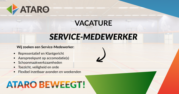 Ben jij gastvrij, praktisch ingesteld en houd je van een dynamische werkomgeving? Voor de (sport)accommodaties van Ataro BV zoeken wij een Service-Medewerker die zorgt voor een veilige, schone en gastvrije omgeving voor bezoekers en gebruikers. Voor deze vacature dien je flexibel inzetbaar te zijn ook op avonden en weekenden.